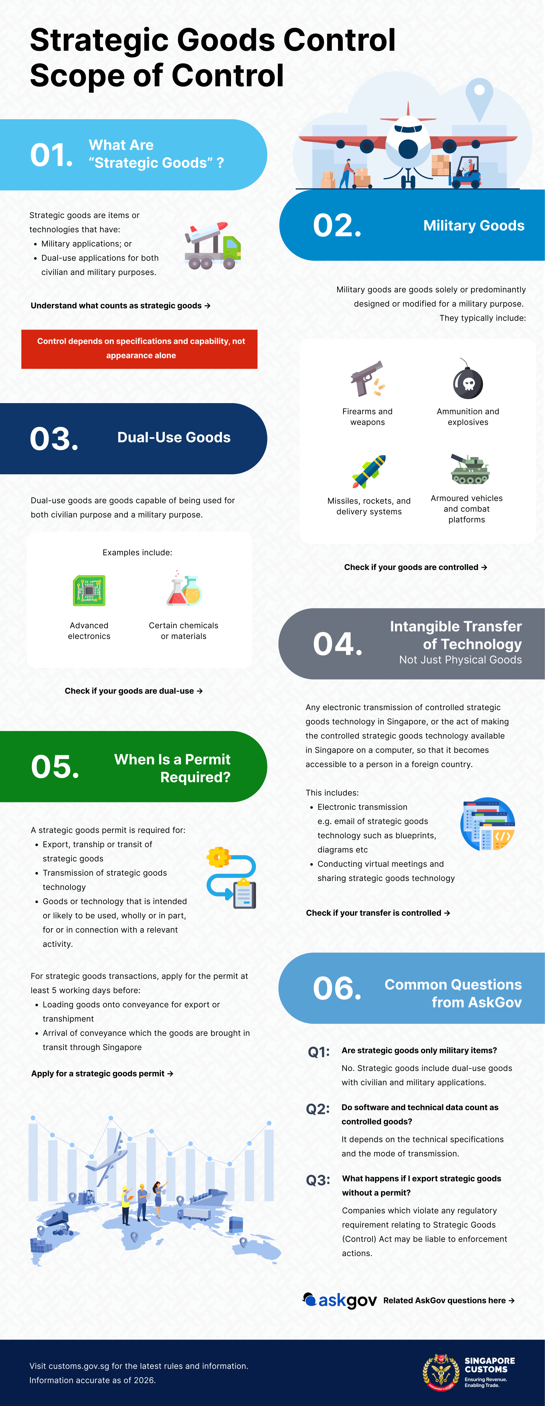 The Strategic Goods Controls List specifies the list of military and dual-use goods, software, and technologies regulated under the Strategic Goods (Control) Act.